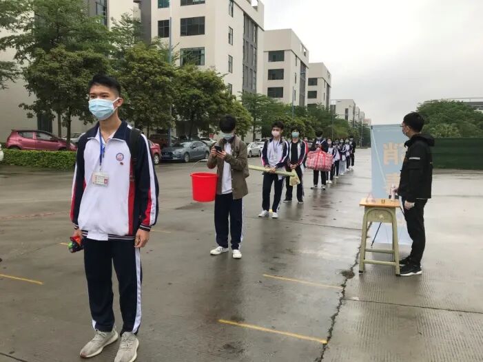 学校大门外设置消毒区、查验区、体温检测点以及观察区,排队入校的学生前后左右各间隔一米,依次排好队伍有序进入。