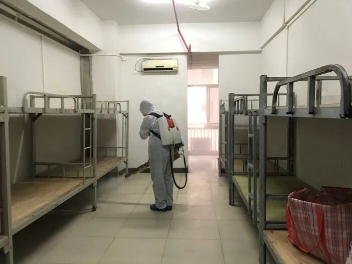 工作人员对出现体温异常的学生宿舍进行全面消毒