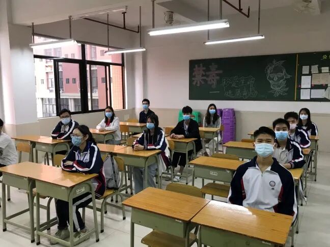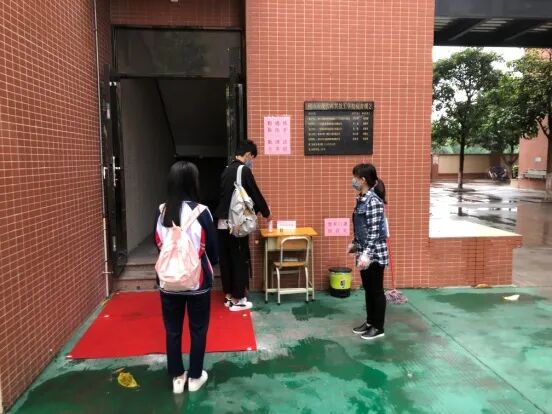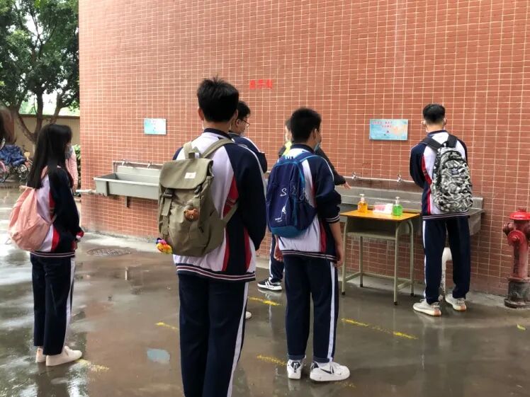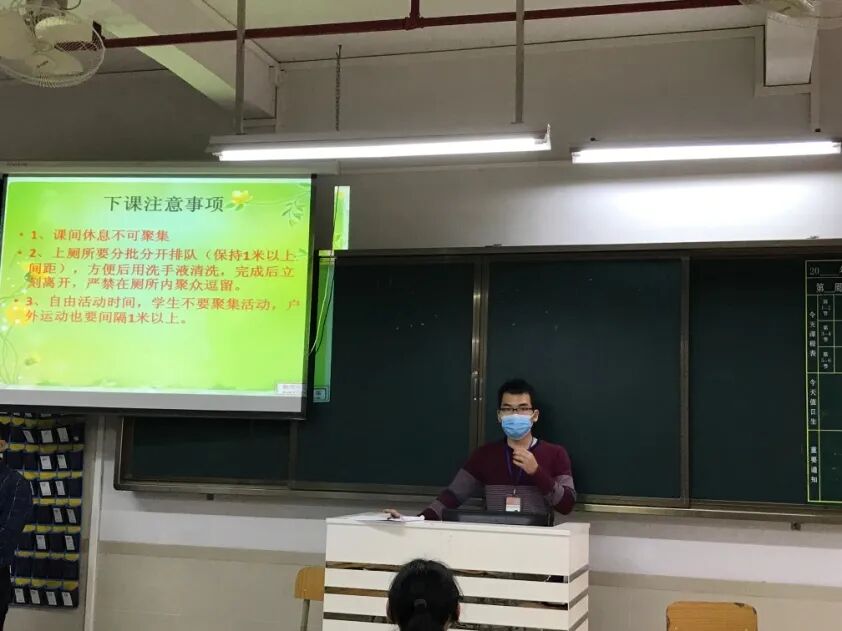 学生依次排队进入课室,科任老师安排2名学生干部对班级学生逐一测量体温,并做好体温检测记录。同时,科任老师对讲台、麦克风、门把手等重点部位进行消毒。师生在教室全程佩戴口罩,学生一人一桌。下课前三分钟,科任老师对学生进行防疫安全教育,敦促学生在课间保持一定距离,不扎堆,不近距离接触,不到其他班串门,有序如厕,避免拥挤,上厕所后要认真洗手。